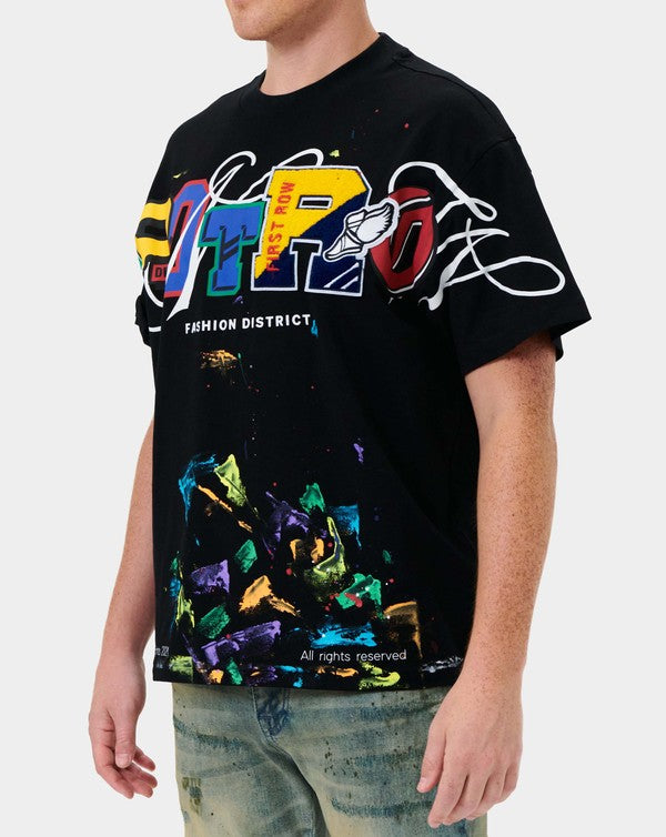 Chenille patch graphic tee with hand painting in multi colors. Featuring a flat hem line and slightly dropped shoulder fit with short sleeves & a ribbed knit crew neck.