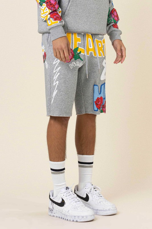 Heart & mind puff print sweatshorts. Featuring a slim and tapered silhouette with cozy fleeced feel inside, an adjustable drawcord at the waist, matching ribbed fabric on the waist, raw hemline, side pockets and one back pocket.