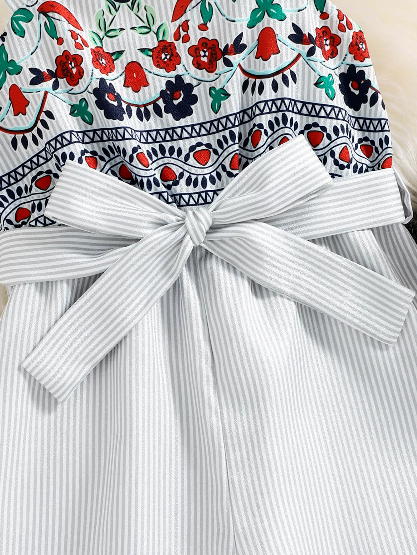Girls Mixed Print Belted Sleeveless Jumpsuit