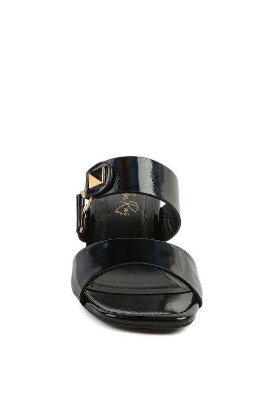 These block-heeled sandals are beautifully detailed with a rock-cut metallic design. These comfortable mid-block heeled slides boast high-end construction and a magnificent finish. The metallic buckle detail on the straps only acts as a cherry on the cake.