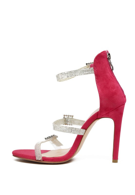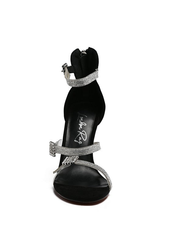 Crystal studded high-heeled sandals are for parties and when you want to bling it up. Available in two color options to choose from quite a steal-worthy design.