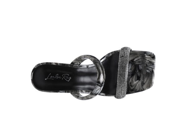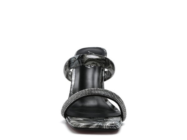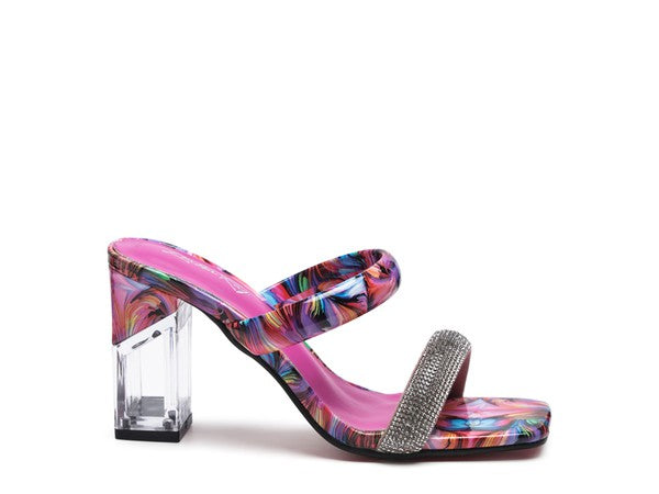 Gorgeous pair of slides in colorful marble prints - has crystal-lined strap detail and a see-through clear block heel.