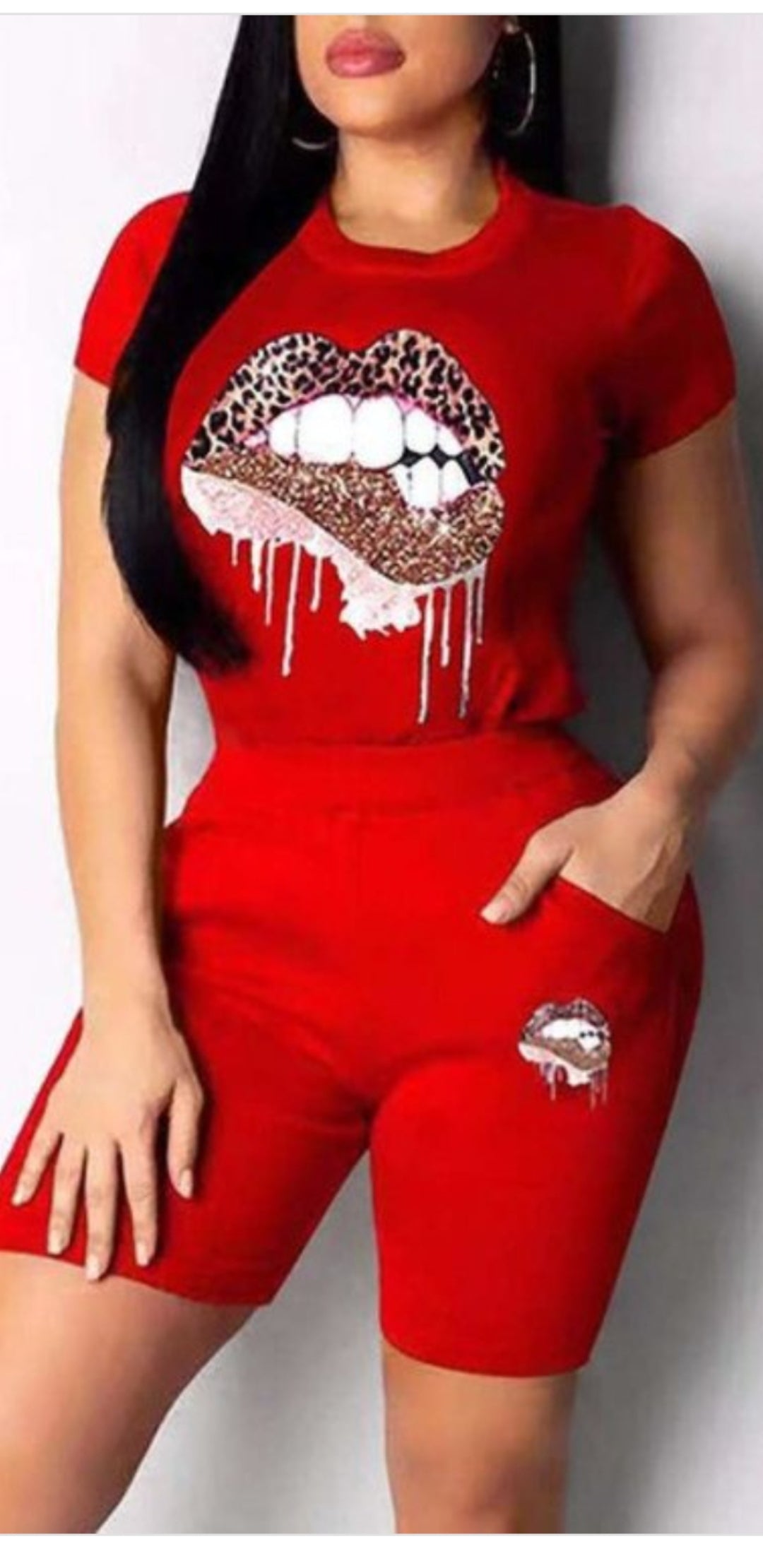 Leopard Lip Print Two Piece Set Tracksuit Women Summer Club Outfits T-shirt Top Biker Shorts Sportwear Lounge Wear Matching Sets