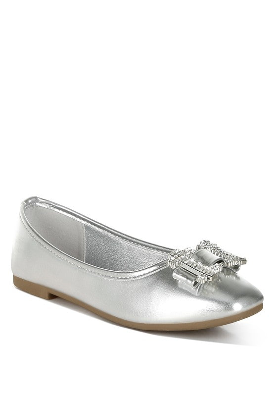 Set new fashion standards with this pair of ballerinas, crafted with premium metallic faux leather. Flaunting an exquisite rhinestone-embellished buckle and plush cushion insoles, these gleaming flats with flat heels are your go-to for a polished look.
