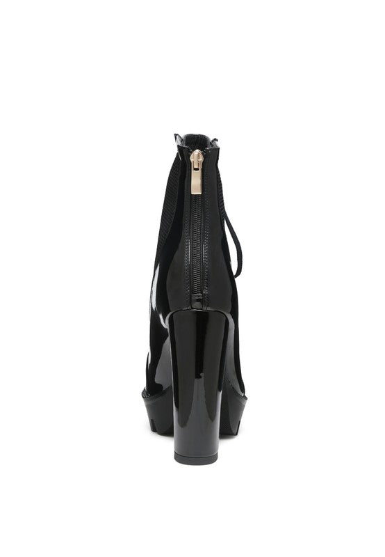A cheeky boot with Patent PU construction has a mesh see-through panel and a lace-up detail. The block-heeled chunky piece is a nice autumn style and comes with a back zipper opening making it easy to wear.