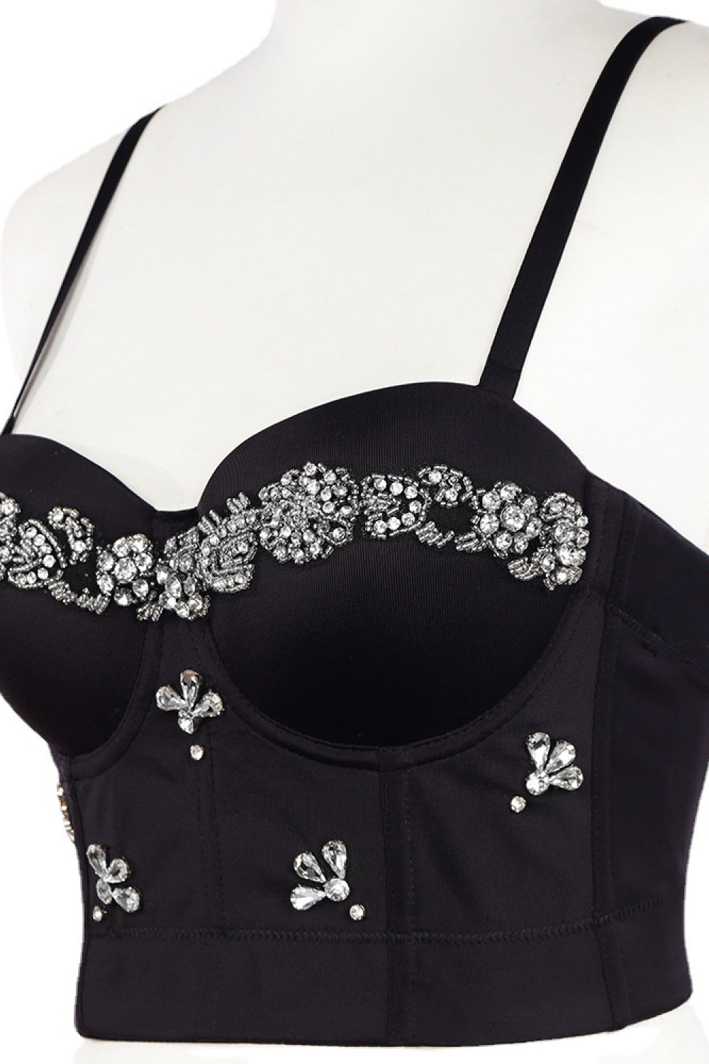 - Features: Rhinestone applique, adjustable straps, hook and eye closure