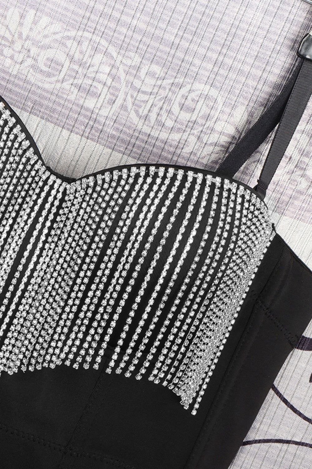 - Features: Rhinestone fringe, adjustable straps, hook and eye closure