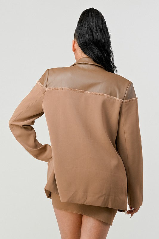 Step out in style with this trendy two-piece set. Constructed from a durable PU material, this brown jacket and skirt set features long sleeves, a front-button closure, and contrast detailing. The included skirt features a ruched design for added flair. Perfect for any occasion, you will look and feel amazing. Imported.