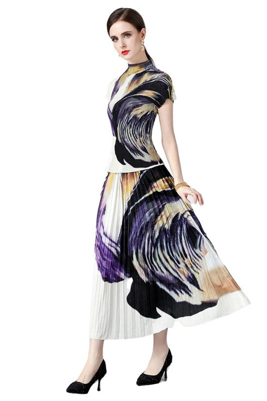 Details-multi print, round neckline, long sleeves, elasticized waist, top and skirt